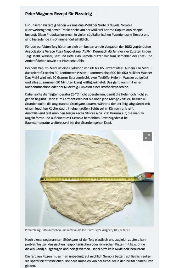 Einen letzten Tipp hat Francesco Ialazzo aber noch. „Viele meiner Kursteilnehmer verzweifeln an einer Sache“, sagt er, „sie bekommen die Pizza nicht auf die Schaufel.“ Dafür gibt es einen Trick: „Einfach Semola darunter schieben“, erklärt Ialazzo. Er nimmt etwas vom feinen Hartweizengrieß auf einen Spachtel und fährt damit rundherum unter die Pizza. Dann hebt er sie an einem Ende mit Daumen und Zeigefinger an und schiebt die Schaufel darunter. Wenn sich der Teig verzogen hat, einfach wieder in Form bringen, ab in den Ofen – und ein paar Minuten später steht dem perfekten Pizzaerlebnis nichts mehr im Weg.